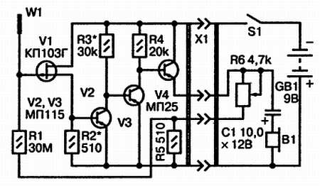 Истоковый повторитель, собранный на транзисторе V1, обладает очень большим входным сопротивлением и чувствителен к слабым наводкам на щуп W1. Эти наводки с частотой переменного тока 50 Гц сначала усиливаются двухкаскадным усилителем на транзисторах V2 и V3, включенных по схеме с общим эмиттером, после чего усиливаются по току транзистором V4, который включен по схеме с общим коллектором. В его эмиттерную цепь включен телефонный капсюль, воспроизводящий звук. Переменный резистор R6 позволяет регулировать начальное напряжение на затворе полевого транзистора.