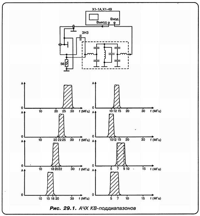 Поскольку высокочастотный импеданс всех диапазонов селектора равен 50 Ом, то при настройке его можно подключать к измерителю АЧХ так, как представлено на рис. 29.1.