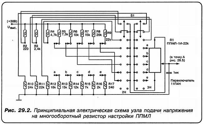 Убедившись в высоком качестве работы предложенного преобразователя напряжения, соединяют его выход с узлом, содержащим многооборотный переменный резистор типа ППМЛ-1И-20 К и вспомогательные резисторы, определяющие пределы изменения величины подаваемого на варикапы постоянного потенциала в каждом из поддиапазонов. Принципиальная (полная) электрическая схема этого узла приведена на рис. 29.2.