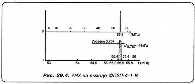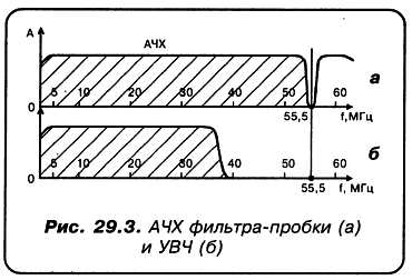 На приведенном рис. 29.3 показаны АЧХ широкополосного УВЧ и фильтра-пробки на частоту 55,5 МГц.