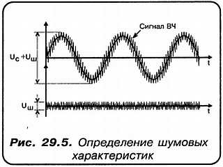 С учетом суммарного коэффициента передачи электронных цепей тракта, при подаче на вход приемника ВЧ-сигнала с амплитудой 5 микровольт, в измеряемой точке уровень сигнала будет составлять величину порядка 30 милливольт. Такой сигнал достаточен для анализа его качественных и количественных характеристик. Поэтому аттенюатором ГСС понижаем уровень входного сигнала до 1 МИКРОВОЛЬТА, а затем производим замеры, сущность которых понятна из приведенного ниже рис. 29.5.