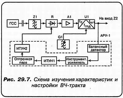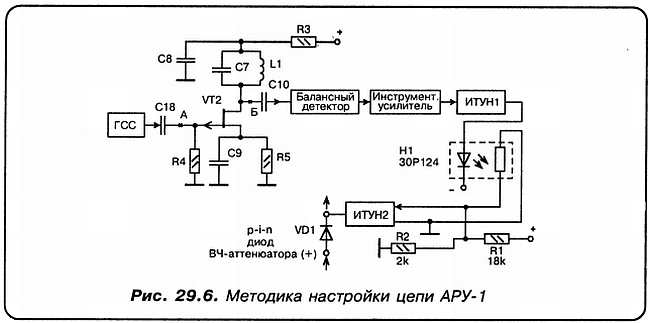 Ранее принцип работы АРУ-1 был полностью описан. Рекомендации по конкретной методике настройки этой цепи — следующие. Отсоединить конденсатор С18 от стока VT1 (рис. 28.4). И далее заняться отладкой системы так, как это изображено на рис. 29.6.