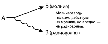 А. Модель задачи условна, в ней искусственно выделена часть элементов технической системы. Наличие остальных элементов только подразумевается. Так, в модели задачи о защите антенны из четырех элементов, необходимых для формулировки задачи (антенна, радиоволны, проводники молния), остались только два, остальные упоминаются в скобках — их можно было бы вообще не касаться.