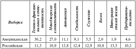 В табл. 5.37 представлены американские данные (выборка – 2000 человек), собранные Э. Шейном, и российские данные, полученные Л.Г. Почебут и В.А. Чикер (выборка – 400 человек).[173] В целом для россиян характерно более равномерное распределение оценок по всем карьерным ориентациям. В американской выборке в наибольшей степени выражена карьерная ориентация на «профессиональную компетентность», которая в российской выборке не является ведущей. Та же тенденция видна и в выборе карьерной ориентации на «менеджмент». Значимые различия выявлены при выборе таких карьерных ориентаций, как «служение», «вызов», «интеграция стилей жизни» и «предпринимательство», – они более предпочитаемы в российской выборке.