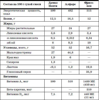 Ряд смесей содержит среднецепочечные триглицериды, что существенно повышает усвоение жиров (Алфаре, Пепти-Юниор, Прегестимил). Высокая усвояемость аминокислотного и жирового компонентов дает возможность рекомендовать их при синдроме кишечной мальабсорбции и при гипотрофии.