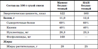 Эта группа смесей применяется в питании детей с лактаз-ной недостаточностью. Различают первичную (как правило, врожденную) лактазную недостаточность и вторичную, возникающую чаще всего после перенесенных кишечных инфекций. Диетотерапия первичной лактазной недостаточности предусматривает применение безлактозных смесей, при вторичной могут использоваться низколактозные смеси (Нутрилон низколактозный). В качестве безлактозных смесей могут использоваться продукты на основе полностью гидролизованных белков (Дамил Пепти, Алфаре и др.), соевые смеси (Хумана-SL, Нутрисоя и др.). Кроме того, существуют и специальные безлактозные смеси Хумана ЛП и ЛП+СТ, Мамекс безлактозный, НАЛ безлактозный (табл. 47).