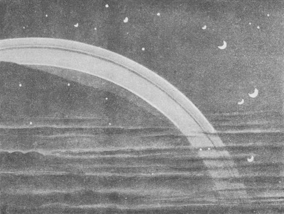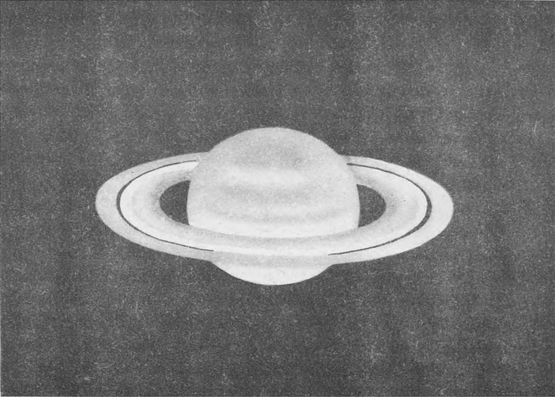 Сатурн особенно интересен при рассматривании его в телескоп, потому что он окружен широким и очень тонким кольцом. Это кольцо так широко, что по нему, как по дорожке, мог бы катиться земной шар. Кольцо расположено в плоскости экватора планеты и вращается тем быстрее, чем ближе к планете расположены его части. Из этого, а также из того, что сквозь кольцо бывают видны звезды, мы заключаем, что это кольцо не сплошное. Кольцо Сатурна является скоплением бесчисленного множества небольших камней, которые обращаются по своим орбитам друг подле друга вокруг Сатурна. Их так много и расстояния между ними сравнительно так малы, что издали для нас промежутки между камешками незаметны, и камешки сливаются в сплошное светлое кольцо. Частички, из которых состоит кольцо Сатурна, — как бы крошечные бесчисленные спутники Сатурна. Это доказал известный советский ученый академик А. А. Белопольский.