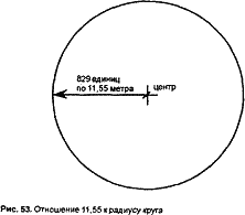 Коэффициент 2,5 — производное от деления круга с помощью композиции весика писцес. Например, на рисунке 53 показано, как пик-билэди можно точно определить с помощью простых геометрических методов, как только было установлено постоянное расстояние в 10 метров. На практике это проделывалось, вероятно, с по мощью двух колышков и шнурка в качестве циркуля. Используя эту систему и простое деление, можно открыть различные древние меры.