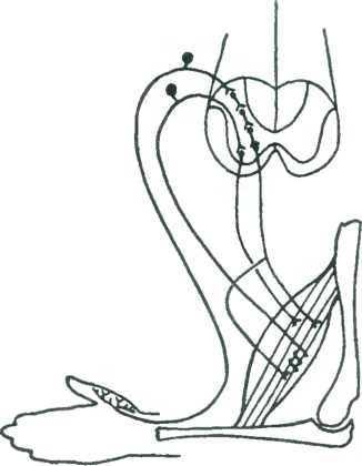 Например, на рис. 47 схематически изображен кожный сенсорный нейрон, способный реагировать (электрическим импульсом) на надавливание в той точке, где он находится. К каким последствиям приводит функционирование такого нейрона? Начнем с того, что он связан со спинным мозгом, где контактирует со многими ассоциативными нейронами. Некоторые из них контактируют непосредственно с двигательным нейроном, который, активизируясь, способен вызвать сокращение мышцы, то есть движение. В свою очередь, движение приводит к изменению сенсорной активности, поскольку давление на сенсорный нейрон уменьшается. Так восстанавливается определенное взаимоотношение между сенсорной и моторной поверхностями. Если бы мы описывали происходящее со стороны, то сказали бы, что рука отдернулась от болевого стимула.