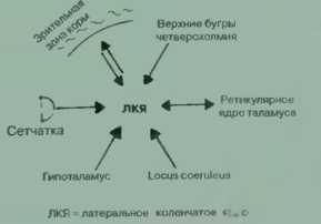 На приводимой ниже схеме изображены мно-I нисленные связи, существующие в лате-альном коленчатом ядре мозга млекопитающих Это ядро — наиболее важная область, QV' формируются связи между сетчатой обо-чкой и центральной нервной системой Каждое из названий, указанных на схеме, со-о ютствует конкретной обособленной сово-??тности нейронов в различных областях цен-альной нервной системы, включая кору ? льших полушарий Ясно, что сетчатая обо-оч ка воздействует на головной мозг не как * лефонная линия, у которой в ЛКЯ находится плейная станция, поскольку более 80 % со-линений поступает в ЛКЯ одновременно. Следовательно, сетчатая оболочка может ишь модулировать, но не определять состояние нейронов в латеральном коленчатом яд-?··, так как их состояние зависит от всех сомнений, образуемых между этим ядром и различными участками мозга Аналогичная схема (разумеется, с иными названиями) может быть составлена и для любого другого центра в центральной нервной системе