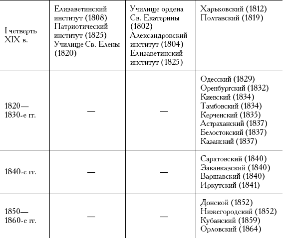 Как видим, в XVIII – первой четверти XIX в. женские институты открывались главным образом в Санкт-Петербурге и Москве. Позднее институты создавались только в губернских городах. 1830-е гг. были временем наиболее интенсивного учреждения женских институтов в губерниях. До этого из 14 существовавших институтов 11 находились в столицах (восемь – в Санкт-Петербурге и три – в Москве) и три в провинции – Харьковский (учрежден в 1812 г.), Полтавский (1819) и Одесский (1829). В 1830-х гг. было создано семь губернских женских институтов: Оренбургский (1832), Киевский (1834), Тамбовский (1834), Керченский (1835) и в 1837 г. – Астраханский, Белостокский и Казанский. В 1840-х гг. в губерниях было открыто еще четыре института: в 1840 г. – Варшавский, Закавказский, Саратовский и в 1841 г. – Иркутский, а в первой половине 1850 г. – два губернских института: Донской и Нижегородский, оба в 1852 г.