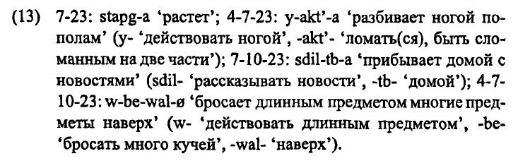 И в данном случае, как кажется, можно констатировать, что принцип стабильности в общем не нарушается. «Относительная свобода следования морф» ограничена точно названными участками цепочки, получает разумное и достаточное объяснение. Подобные вещи, по-видимому, возможны только в языках, где слово (а) всегда начинается с корня, (б) композиция запрещена (ср. выше 0.3, 0.4). Подобные языки принято называть «полисинтетическими», но этот термин, как и «инкорпорирующие», типологической характеристикой не является.