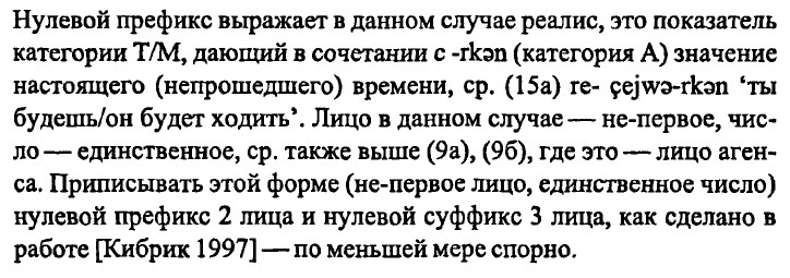 Следует вообще воздерживаться от соблазна «плодить лишние нули». Например, в чукотско-корякских языках (ср. выше, 1.3.1) левая и правая терминальные позиции в модели глагольной словоформы, занятые показателями категорий Р и Р/Num соответственно, нулевых морфем не имеют, равно как не имеют их позиции, занятые показателями Рob. Личное спряжение в чукотско-корякских языках организовано строго дистрибутивно: маркируется либо левая, либо правая терминальная позиция. Лишь в одной точке парадигмы лицо не выражено вообще никак, ср. чукотск.: