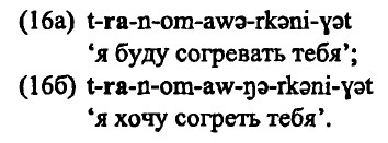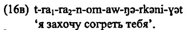 Морфа — ra- в обоих случаях занимает один и тот же квазипорядок (ср. выше, 1.0, также ниже, 4.1) как относительно левой границы словоформы, так и относительно корня (морфа — от-), но порядки у морфы — ra- разные. В (16а) она соотнесена со значением футура, в (16б) — со значением дезидератива, который выражается циркумфиксом: