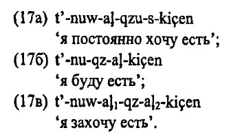 В данном случае — al1- имеет значение дезидератива, — аl2— футуральное значение. Они разделены показателем имперфективного вида — qz(u) — и не могут, как в чукотском, занимать смежных позиций.