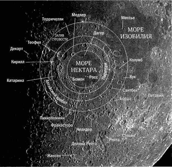На это замечательное образование, так хорошо сохранившее следы своего происхождения, каждый владелец телескопа должен обратить особое внимание и потратить на него несколько вечеров хорошей видимости. При наличии небольшого опыта и сноровки вы сможете распознать три и даже больше концентрических колец бассейна. Все они, однако, разрушены и местами прерываются. Например, части колец, которые находятся севернее и восточнее Моря Нектара, были уничтожены лавой из соседних морей Спокойствия и Изобилия.