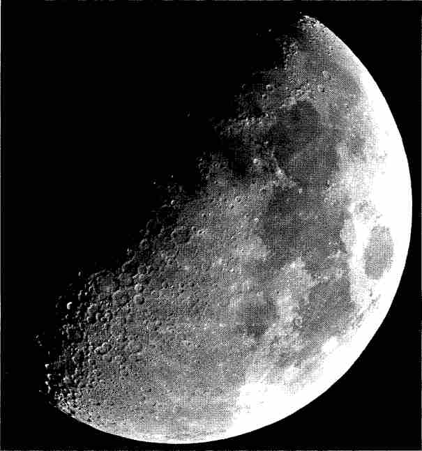 Рис. 3.33. Луна в первой четверти. Видны (сверху вниз) Моря Ясности, Спокойствия, Кризисов, Изобилия и Нектара.