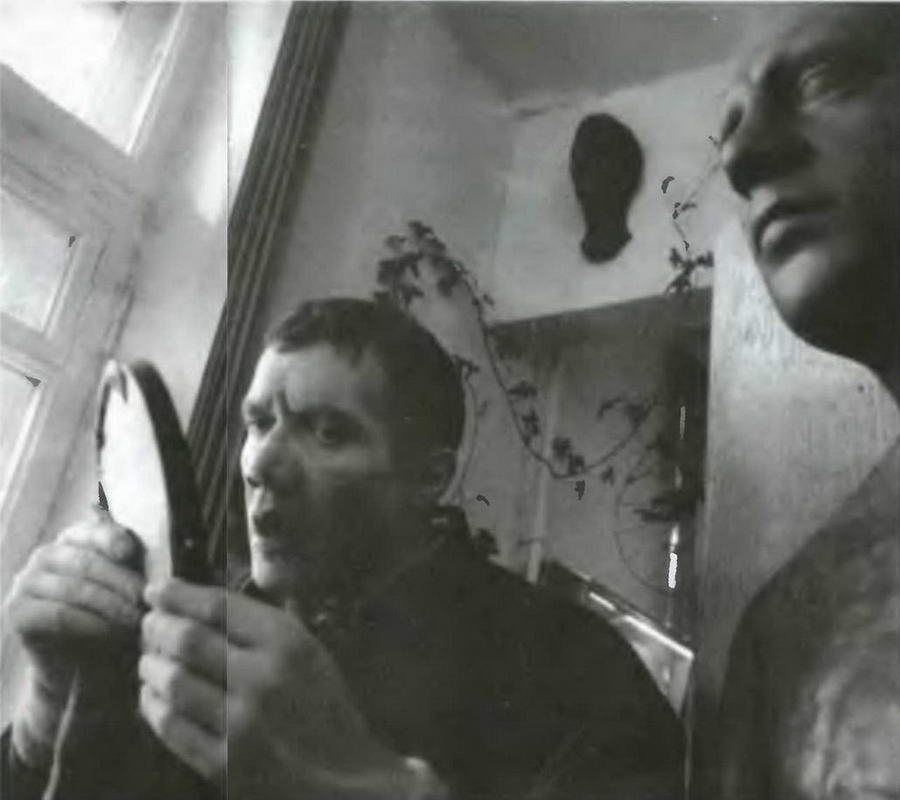 Человек, который смотрится в зеркало, чтобы создать свой скульптурный портрет. Скульптура психотерапевтически воздействует на пациента, реконструируя утраченный им образ своего "я".