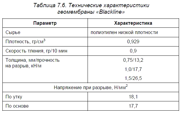 Геомембрана «Blackline» поставляется заранее сваренными секциями площадью до 700 м2. Эти секции составляют основу для создания быстро монтируемой — до 5000 м2 в день — и эффективной защитной системы. 85 % сварочных работ выполняется на заводе, и тем самым достигается минимум сварочных работ на стройплощадке. Область применения геомембраны «Blackline» практически не ограничена: контролируемые площадки, декоративные пруды, хранилища дождевой воды, бассейны для сточных вод, отстойники и разного рода хранилища. Основные характеристики материала даны в табл. 7.6.