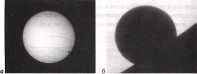 Рис. 9.3. (а) Прохождение Венеры по диску Солнца 8 июня 2004 года в 11 часов всемирного времени. Фото: USNO. (б) Венера на лимбе Солнца. Поярчание края диска Венеры на фоне темного неба вызвано преломлением света в толстой атмосфере Венеры. Фото: Голландский солнечный телескоп на о. Ла-Пальма.