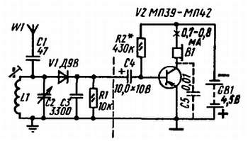 Диода, как видишь, в нем нет. Транзистор включен по схеме ОИ. Между входным колебательным контуром L1C2 (может быть любым) и затвором транзистора включен конденсатор С3 (100–150 пФ), а между затвором и истоком — резистор R1 (750 кОм -1,5 МОм). Головные телефоны, включенные в цепь стока, заблокированы конденсатором С4 (2200–3300 пФ). Источником питания служит батарея GB1 напряжением 9 В (две батареи 3336Л, соединенные последовательно). Питание включают выключателем S1.
