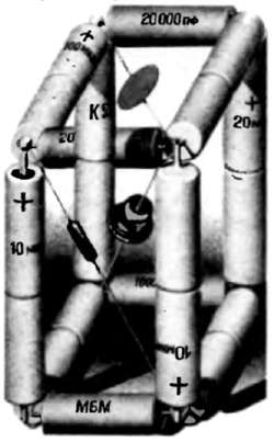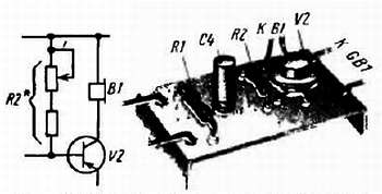 Обращаю внимание на полярность включения электролитического конденсатора С4. На базе транзистора по отношению к «заземленному» проводнику — отрицательное напряжение, равное примерно 0,1 В. Поэтому электролитический конденсатор должен подключаться к базе отрицательной обкладкой, т. е. обязательно нужно соблюдать полярность электролитического конденсатора.
