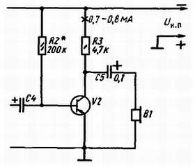 В этом случае резистор R3 будет выполнять функцию нагрузки транзистора. Создающиеся на нем колебания звуковой частоты, т. е. низкочастотная составляющая коллекторного тока, через конденсатор С5 будут поступать к телефонам В1 и преобразовываться ими в звуковые колебания. Конденсатор С5 может быть электролитическим емкостью 1–5 мкФ на номинальное напряжение не менее, чем напряжение источника питания Uи. п. В данном случае выводом отрицательной обкладки он должен подключаться к коллектору транзистора, а выводом положительной обкладки к телефонам.