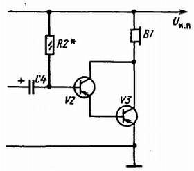 Зависит ли громкость звучания телефонов от статического коэффициента передачи тока h21э транзистора? Конечно, и значительно больше, чем от напряжения источника питания. А чем больше h21э используемого транзистора и напряжение источника питания, тем больше должно быть сопротивление резистора в базовой цепи транзистора. В твоем распоряжении могут оказаться транзисторы с малым коэффициентом h21э, например, равным 10–15. Транзистор с таким h21э даст меньшее усиление низкочастотного сигнала и телефоны будут звучать тише. Но и в этом случае можно добиться громкого радиоприема, если в усилителе будет работать не один, а два таких транзистора. Соедини их так, как показано на рис. 95: коллекторы транзисторов вместе, а эмиттер первого транзистора V2 — c базой второго транзистора V3. Получится так называемый составной транзистор V2V3.