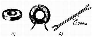 Рис. 100. Ферритовое кольцо (а), высокочастотный дроссель (б) и проволочный челнок для намотки провода