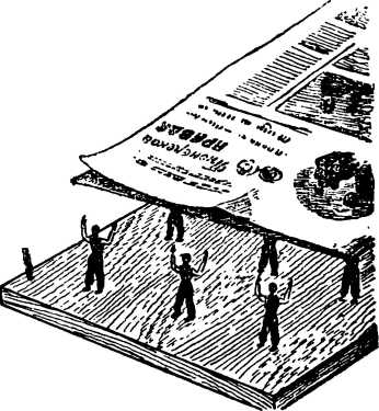 Если вы будете водить газетой над фигурками, то они станут раскачиваться, как бы делая гимнастические упражнения. Этот опыт удачно проходит, если взяты чистая щетка и сухая газета, а фигурки сделаны легкими, из тонкой бумаги, как показано на рисунке 52.