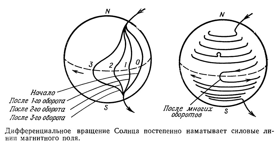 В настоящее время широко принято, что солнечная активность своим происхождением обязана магнитному полю и что она возникает вследствие того, что Солнце не вращается как жесткое тело. Наблюдения показывают, что экваториальная зона постоянно опережает при своем вращении полярные области. Возможно, хотя не существует ни доказательств, ни отрицания этого утверждения, внутренние слои Солнца вращаются быстрее внешних. К чему это нас приводит?