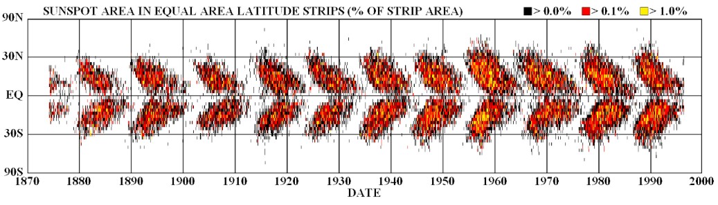 Рис. Широтно-временное распределение пятен — «Бабочки Маундера». С развитием цикла пятна появляются ближе и ближе к экватору.