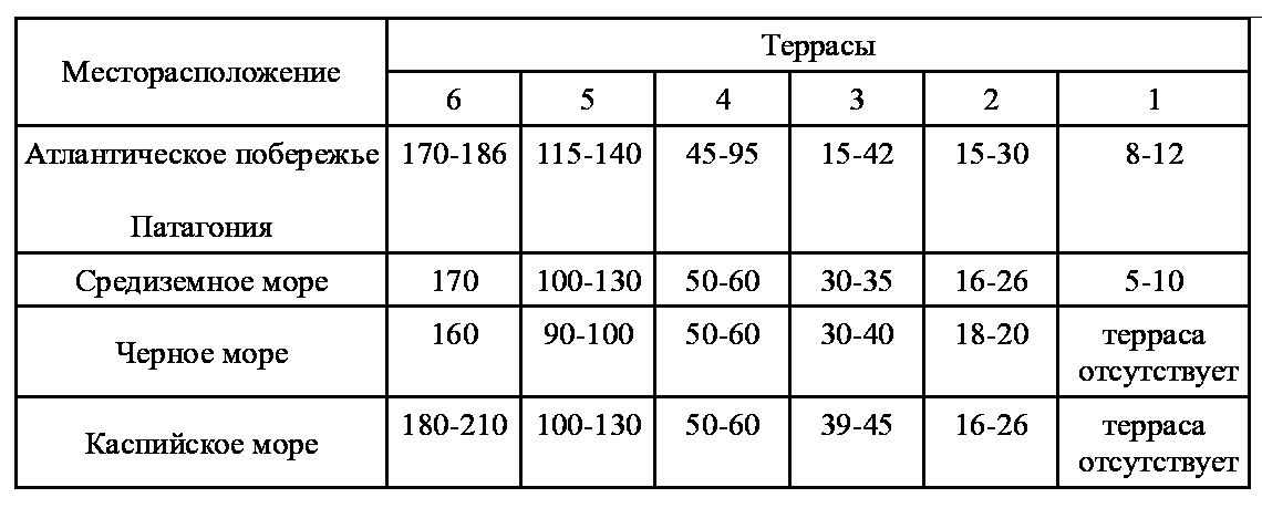 Земляк и коллега Ламота Ш. Депере стал искать такие же террасы на побережье Средиземного моря — и обнаружил их на Лазурном берегу, в Ницце. Вслед за тем подобные же шесть террас геологи нашли по всему побережью Средиземного моря, на реках Серет и Дунай в Центральной Европе, на реке Норт-Платт, притоке Миссури, в штате Небраска (США), на побережье Черного и Каспийского морей, на атлантическом побережье Патагонии в Южной Америке. Сравните сами, как хорошо совпадают высоты террас различных побережий: