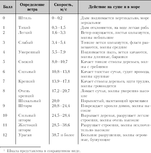 Движение воздуха. Неравномерное прогревание различных участков земной поверхности приводит к перемещению воздушных масс. Холодные и тяжелые массы воздуха непрерывно вытесняют более теплые и легкие, создавая ветер. Скорость или сила ветра измеряется узлами, баллами и метрами в секунду. В соответствии с этим была предложена следующая шкала ветров (табл. 2.3).