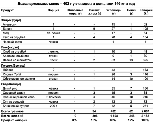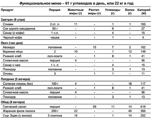 Чтобы вам было легче разобраться в этой фантасмагории, я составил три сытных меню: функциональное (близкое к моему, с той разницей, что я не ем хлеб и не пью мандариновый сок), так называемое «здоровое» (на основании The Food Guide Pуramide, в начале книги) и вегетарианское. В состав каждого входит типичный дневной набор продуктов, который я «разложил» на жиры, белки и углеводы. Надеюсь, вы согласитесь, что ни «пирамидник», ни вегетарианец, ни я не останемся голодными, так как количество калорий во всех трех меню примерно одинаковое.