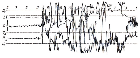 Рис. 8. Наступление магнитной бури, как оно выглядит на магнитограмме. По горизонтальной оси отложено время, по вертикальной — величины трех составляющих вектора магнитного поля