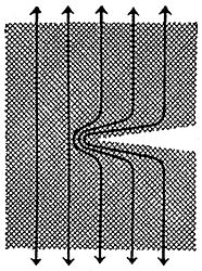 Посмотрим, что получается, когда трещина приближается к подобной поверхности, расположенном перпендикулярно к направлению ее движения. Вначале к поверхности раздела подойдет зона растяжения, которая движется впереди трещины, и она попытается разорвать тело по этой поверхности на каком-то участке. Если прочность поверхности раздела больше 1/5 от общей прочности сцепления материала, то эта поверхность не разрушится, трещина лишь пересечет ее и поведение материала не изменится. Если, однако, прочность границы раздела меньше примерно 1/5 от величины сцепления материала, то она будет разрушена, прежде чем главная трещина достигнет ее, и образуется ловушка, которая поймает и остановит трещину[31].