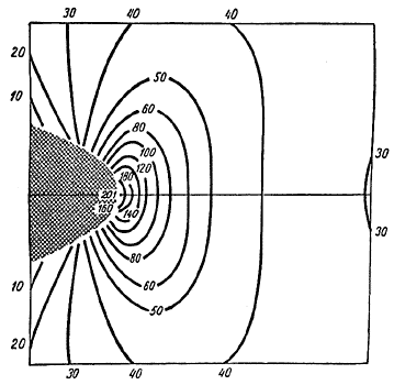 Растягивающие напряжения направлены под прямым углом к трещине, то есть параллельно приложенной нагрузке. Заштрихованная область представляет собой трещину. Вдоль кривых коэффициенты концентрации постоянны, числа, проставленные на них, показывают, таким образом, во сколько раз местное напряжение превышает среднее по образцу. Максимальная величина концентрации - около 200. Абсолютная величина концентрации зависит от длины трещины, но пропорции остаются неизменными.