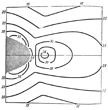 Рис. 32. Концентрация напряжении вблизи кончика эллиптической трещины. Растягивающие напряжения направлены параллельно трещине, то есть под прямым углом к направлению приложенной нагрузки. Для этого случая максимальная концентрация составляет около 40 - т.е. пятую часть концентрации, показанной на предыдущем рисунке.