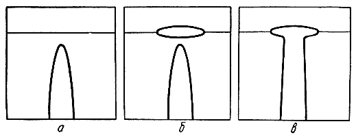 Рис. 33. Механизм торможения трещины по Куку-Гордону. а?—?трещина приближается к слабой поверхности; б?—?поверхность перед трещиной разрушается; в?—?Т-образный тормоз для трещины. На практике трещина обычно отклоняется, как показано на рис. 34.