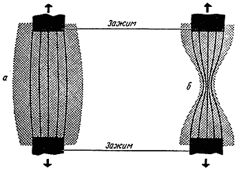 Рис. 35. Эксперименты Орована со слюдой. а - образец с ненагруженными кромками, прочность его 320 кГ/мм2; б - нагрузка на кромках равна среднему напряжению в образце, прочность его 17,5 кГ/мм2.