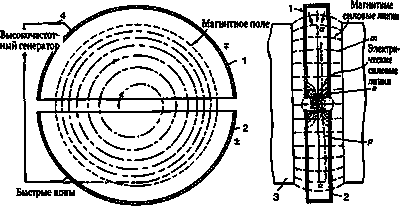 Тогда же американец Эрнест Лоуренс (1901–1958) разработал более мощный ускоритель, названный циклотроном (рис. 18.4). Лоуренс закончил Йельский университет и затем перебрался в Калифорнийский университет. Там он обнаружил статью норвежца Рольфа Видерое, который считал, что частицы легко можно ускорять шаг за шагом, если они движутся по кругу отклоняемые магнитным полем. На каждом обороте частицы проходят сквозь разность потенциалов и увеличивают свою скорость. В 1932 году Лоуренс со своим студентом построили такой ускоритель и использовали его для разгона частиц до энергий более 1 МэВ. Они смогли подтвердить результаты Кокрофта и Уолтона. Циклотроны вскоре стали широко использоваться: через пять лет в мире работало уже около двадцати таких ускорителей.