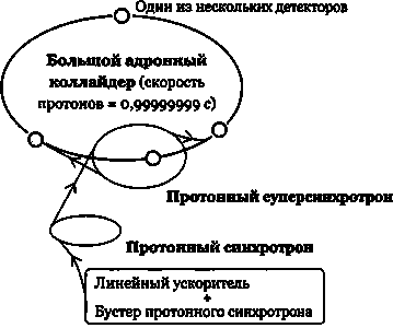 В начале 1950-х годов циклотрон получил дальнейшее развитие в виде синхротрона, в котором энергия столкновений превзошла 1000 МэВ (это 1 ГэВ, гигаэлетронвольт). Сейчас самый мощный ускоритель находится в Европейском центре ядерных исследований (ЦЕРН) в Женеве. К тому же в ЦЕРНе заканчивается строительство нового коллайдера (ускоритель на встречных пучках) — Большого адронного коллайдера (БАК), занимающего круговой туннель длиной 27 км. Этот туннель находится на глубине около 100 метров между Женевским аэропортом и ближайшими Юрскими горами. Прежде чем попасть в это огромное кольцо, частицы будут ускоряться поэтапно, каждый раз увеличивая свою скорость и энергию: предварительные стадии включают в себя линейный ускоритель, бустер, протонный синхротрон и протонный суперсинхротрон. В главном круговом ускорителе, двигаясь в противоположных направлениях по двум трубам, протоны будут разгоняться до скорости в 0,99 999 999 от скорости света! БАК будет сталкивать протоны с энергией 7 ТэВ (ТэВ = 1000 ГэВ) каждый, с полной энергией столкновения 14 ТэВ. Каждый протон будет обладать кинетической энергией летящего комара — для протона это гигантская энергия! При таких энергиях, в миллионы раз превышающих те, которые достигал Лоуренс, могут рождаться частицы совершенно нового типа (рис. 18.5).