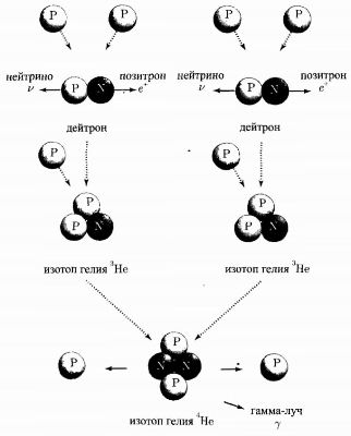 Рис. 9. Стандартная протон-протонная цепочка, изображенная на этом рисунке, — одна из главных последовательностей термоядерных реакций, с помощью которых Солнце вырабатывает свою энергию. Окончательным результатом этого процесса является превращение четырех протонов в одно ядро гелия плюс высвобождение дополнительной энергии, остающейся для питания Солнца