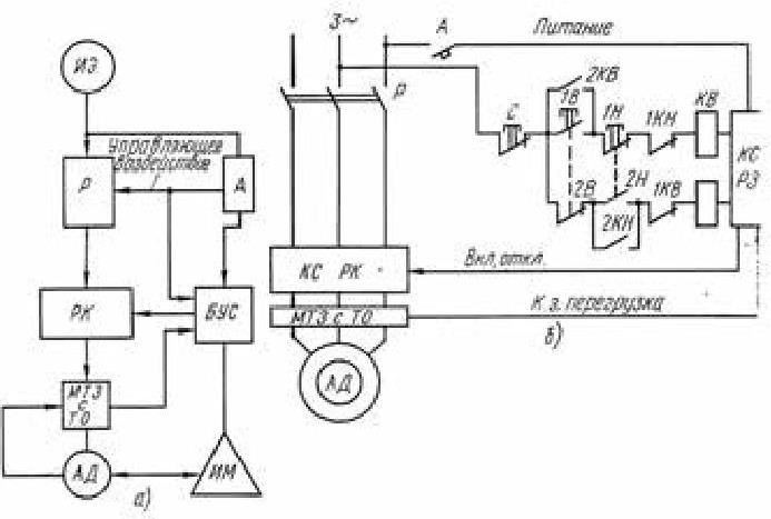 а – структурная, б – функциональная; ИЭ – источник электроэнергии, Р – рубильник, А – автомат, РК – реверсивный контактор, БУС – блок управления и сигнализации, МТЗ с ТО – максимальная токовая защита с токовой отсечкой, АД – асинхронный двигатель с короткозамкнутым ротором, ИМ – исполнительный механизм, КС РК – контактная система реверсивного контактора, С – кнопка «Стоп», 2КВ – контакт самоблокирования питания обмотки КВ, 1В – 2В – кнопка «Вперёд», 1Н – 2Н – кнопка «Назад», 1КН, 1КВ – контакты блокировки от неправильных действий схемы, КВ – обмотка контактора «Вперёд», КС РЗ – контактная система релейной защиты, 2КН – контакт самоблокирования питания обмотки контактора «Назад».