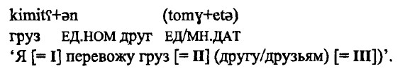 В (23 б) выступает номинативная конструкция, возможная только при непереходном глаголе: подлежащее «я» здесь — в номинативе (не в инструменталисе, как в (23а)), а дополнение «груз» — не прямое (в номинативе), а косвенное (в инструменталисе); при этом оно факультативно и часто опускается. Тем не менее, существительное КIMIT?- «груз» остается ГСинтА II и по-прежнему соответствует СемА «Y» [что перевозится]. Иначе говоря, мены диатезы здесь не происходит, так что при нашем определении детранзитивация — не залог. (Пропозициональное значение глагола в обеих фразах тоже остается неизменным, так что русский перевод искажает действительную картину.)