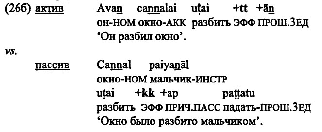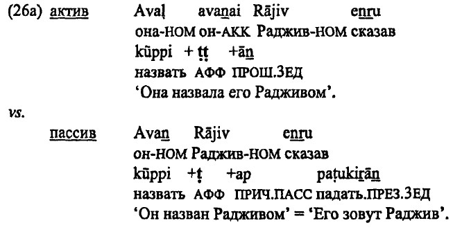 Из этих примеров ясно видно, что граммемы направленности семантически «воздействуют» на семантические, а не на синтаксические актанты глагола: так, глагол «называть» остается в аффективе независимо от залога, ибо в тамильском языке называние касается главным образом Назывателя. Никаких оснований трактовать направленность как залог нет.