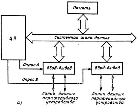 Существуют три основных метода управления операциями ввода-вывода. Наиболее простой и очевидный метод заключается в том, чтобы разрешить ЦП управлять всеми операциями ввода-вывода. Этот метод, называемый программным вводом-выводом (или вводом-выводом с опросом), обеспечивает ЦП полное управление ситуацией, но оказывается наименее гибким и довольно медленным. По существу, ЦП периодически опрашивает каждое периферийное устройство (через соответствующую схему ввода-вывода), не требует ли оно обслуживания. Если запрос имеется, ЦП выполняет необходимую процедуру обслуживания. Когда воспринят запрос на обслуживание, все запросы от других периферийных устройств игнорируются; эти устройства должны ожидать до тех пор, пока ЦП не освободится для обработки их запроса на обслуживание.