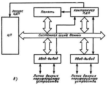 Согласно третьему, самому сложному методу управления вводом-выводом внешним устройствам обеспечивается полный доступ к пространству памяти системы без всякого участия ЦП в передачах данных. Такой метод называется прямым доступом к памяти (ПДП) и оказывается очень эффективным. Данные можно передавать с исключительно высокой скоростью (так как вмешательства ЦП не требуется), поэтому ПДП используется, например, для передач данных в накопитель на твердом диске или из него. В простых управляющих применениях ПДП не требуется, но о нем нужно знать. Упрощенные структурные схемы всех методов управления вводом-выводом показаны на рис. 7.5.