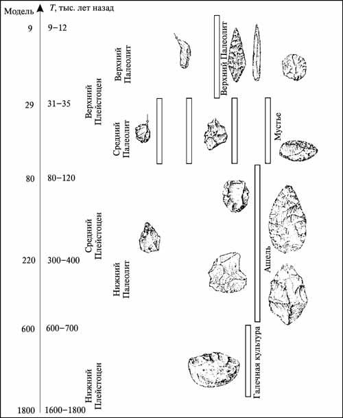 Представление о преобразовании времени, когда его интервалы образуют геометрическую прогрессию, позволяет сравнивать явления глобальной истории, происходящие в разные эпохи, в которых историческое время течет по-разному. Обратимся для начала к развитию человечества в каменном веке. С помощью методов датировки, в том числе и физических, основанных на явлениях радиоактивности, на всем этом интервале времени возраст тех или иных находок удается определить с точностью до нескольких процентов. От этой, весьма удаленной от нас эпохи остались в основном каменные орудия, которые благодаря исследованиям нескольких поколений археологов и палеоантропологов и дали основные сведения о развитии технологии, а также о расселении человека на протяжении более чем миллиона лет. Однако сколько-нибудь точных и объективных методов определения численности населения для палеолита нет, а косвенные оценки дают только порядок величин.